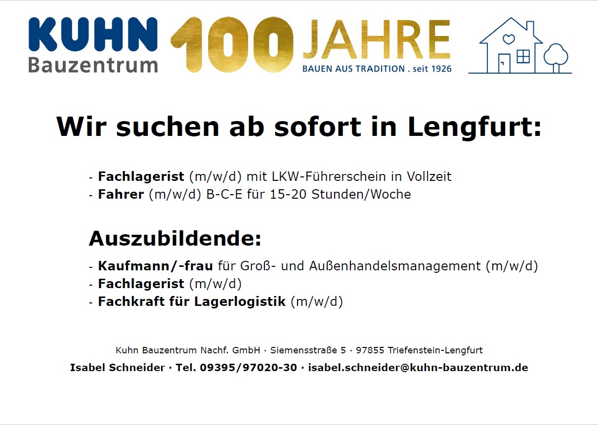 Schicken Sie Ihre Bewerbungsunterlagen an Isabel Schneider (personal@kuhn-bauzentrum.de).